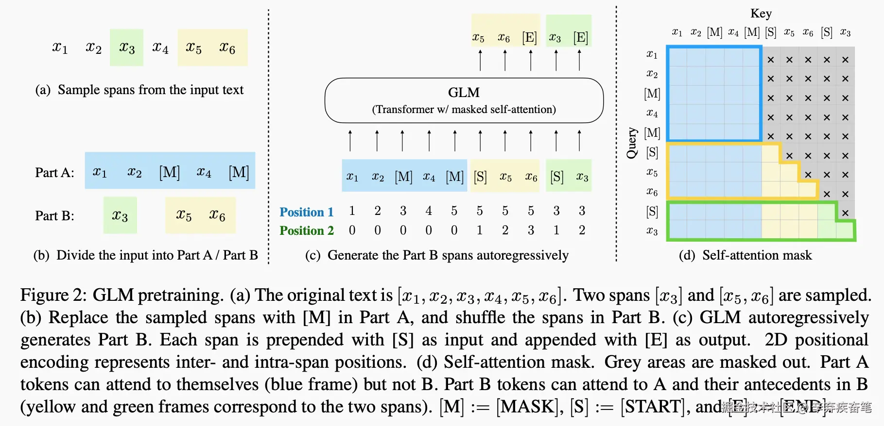 在图(C)中,有两个位置 Position 1/2,其中Pos 1是用来表示被破坏(就是经过掩码)之后的序列中,每个Token的标号,Pos 2是用来表示某个被掩码掉的Span中中间的序列信息,非掩码部分填充为0。两个位置id通过可学习的嵌入表被投影成两个向量,这两个向量都被添加到输入标记嵌入中。这里有一个好处,就是这种编码方式可以让模型在重建时不知道被掩码部分的长度信息。这也是因为,GLM模型的下游任务其实无法事先知道掩码部分的token的长度。