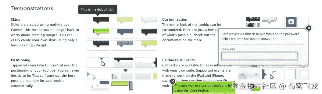 我也这么认为 tipped(projects.nickstakenburg.com/ tipped)是使用画布来增强页面的一个很好的例子。通过 JavaScript API 以编程方式绘制工具提示,无需担心图像。使用 Canvas 及其 JavaScript API 可以轻松创建新的皮肤和主题,以及圆角、阴影和渐变等效果。此外,通过 ExCanvas 提供的 IE6-8 兼容性(我们很快就会看到),我们可以获得完全支持 IE 的所有 CSS3 风格的效果。
