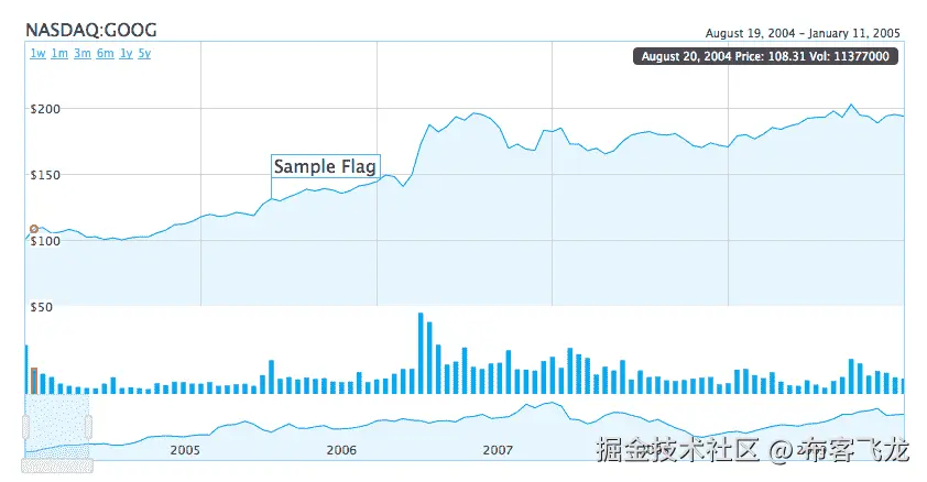 humble fence(www.humblesoftware.com/金融/指数)是一个 HTML5 驱动的谷歌金融风格的图表演示。因为 Canvas 只是另一个 HTML 元素,所以您可以很容易地在它上面放置其他的<div>(或任何其他 DOM 对象), HumbleFinance 在这里已经为图表标签和其他文本做了这样的工作。