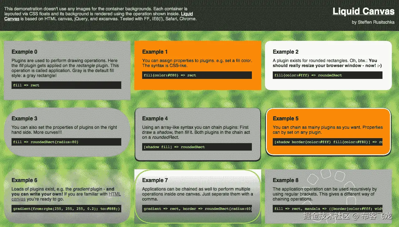 一些最好的画布例子使用 Processing . js(processingjs.org/),这是处理可视化编程语言的 JavaScript 端口。例子从简单的游戏到抽象的数字艺术,再到可视化。