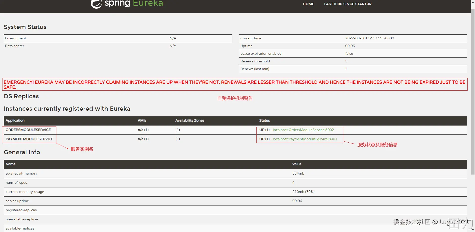 概述:自我保护模式主要用户一组客户端和Eureka Server之间存在网络分区场景下的保护,一旦进入保护模式Eureka Server将会尝试保护其服务注册表中的信息,不再删除服务注册表中的数据,也就是不会注销任何微服务