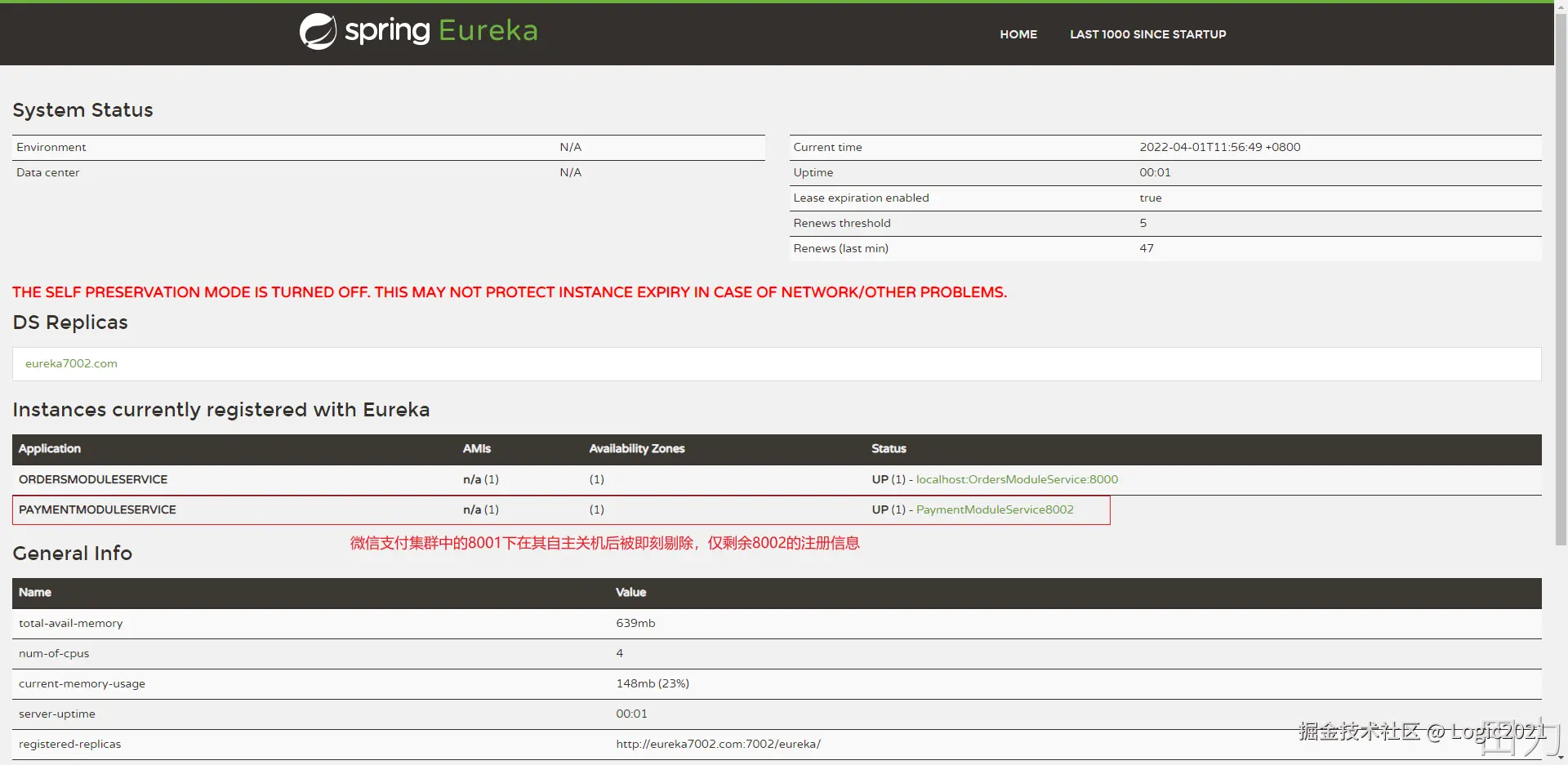 出现THE SELF PRESERVATION MODE IS TURNED OFF. THIS MAY NOT PROTECT INSTANCE EXPIRY IN CASE OF NETWORK/OTHER PROBLEMS.说明已经关闭自我保护机制