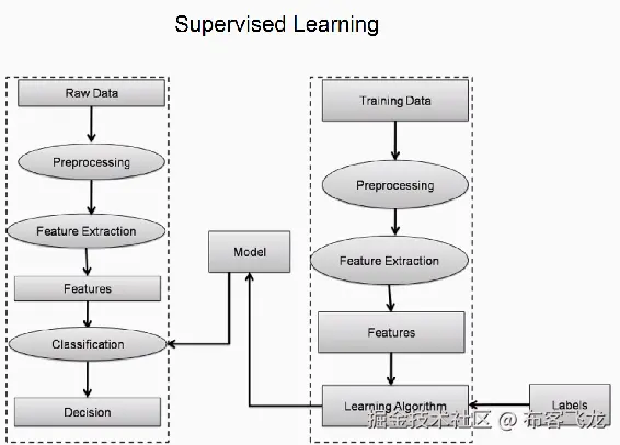 假设我们有一些训练数据。在此基础上,我们可以做一些预处理,并提取重要的特征。这些特征将被赋予给一个学习算法,附带一些由人类专家分配的标签。该算法然后将学习并创建一个模型。一旦模型被创建,我们就可以获取新数据,对其进行预处理,并从中提取特征;基于这些特征,我们然后将数据发送到模型,该模型将在提供决策之前进行某种分类。当我们完成这个过程,当我们有一个人给我们提供标签时,这种学习就被称为监督学习。