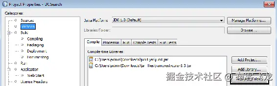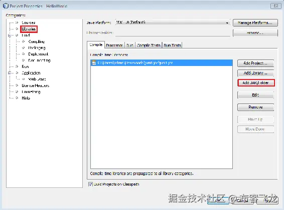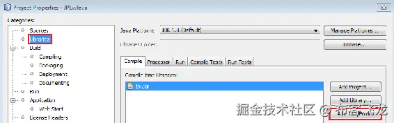 - 在 Properties 选项卡中,选择 Libraries,点击 Add JAR/Folder,并给出
