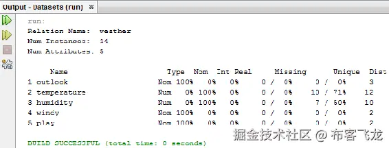 它有作为weather的Relation Name,它有14实例和5属性。它显示属性的统计数据。如果我们转到 NetBeans 中的Datasets项目文件夹,我们可以检查weather.arff文件是否已经保存:
