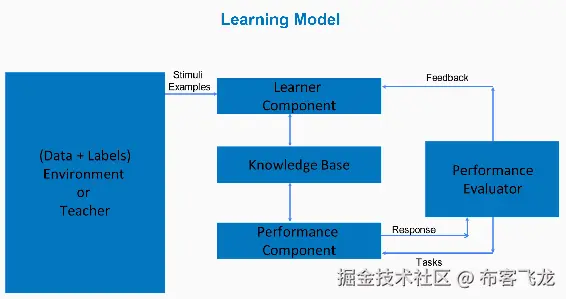 在上图中,我们有一个老师,我们有数据,我们给它们添加了标签,我们还有一个老师分配了这些标签。我们将它交给一个学习器组件,它将它保存在一个知识库中,从中我们可以评估它的性能并将其发送给一个性能组件。在这里,我们可以有不同的评估方法,我们将在下一章中看到,使用这些方法,我们可以向学习组件发送反馈。随着时间的推移,这个过程可以得到改进和发展。