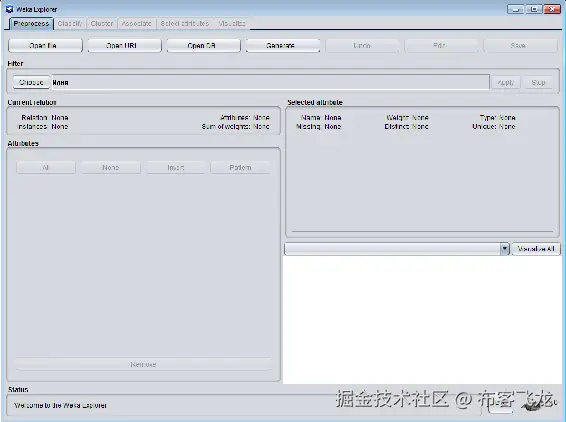 我们现在将转到 Weka Explorer。单击 Applications 下的 Explorer 按钮,我们将看到一个新窗口,如下面的屏幕截图所示: