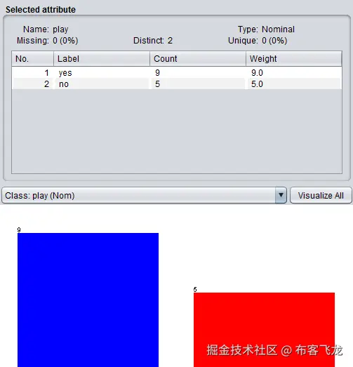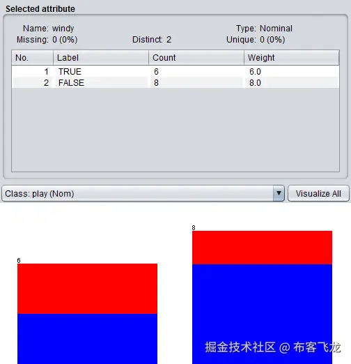 前面的数据集有五个属性。第一个属性是outlook,outlook有三个标签,在Label列下有三个不同的值:sunny,有一个Count为5;overcast,带一个4的Count;和rainy,带一个5的Count。同样,还有windy属性,windy有两种值,TRUE和FALSE,带计数,如下面截图所示: