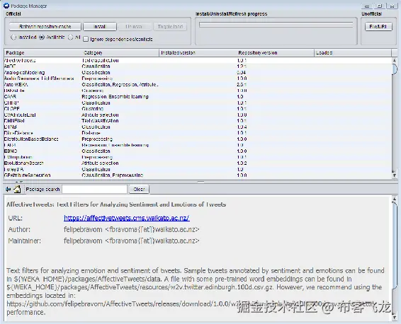 前面的屏幕截图显示了 Weka GUI。我们可以看到程序选项、可视化和工具。在工具中,我们将看到软件包管理器,在这里我们可以安装 Weka 上可用的任何软件包: