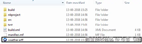 由于我们的构建已经成功,我们将我们的weather.csv转换为weather.arff。让我们去看看磁盘,看看它是否工作: