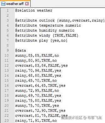 这个文件有一个relation,我们可以在这里给出文件名,它还有一个@attribute对象。@attribute对象告诉我们这些是文件的属性,在花括号中,我们可以指定分类值。例如,temperature和humidity属性是numeric值,windy是布尔值,@attribute play是可以有yes和no的类。然后,我们有@data,其中显示了所有带有属性值的元组。这就是 ARFF 档案的工作方式。