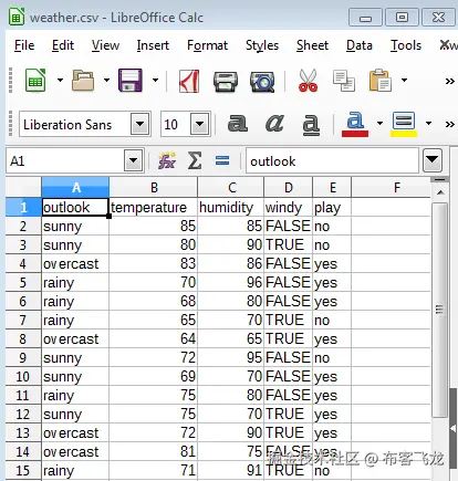 通常,所有 CSV 文件都可以直接在任何电子表格应用程序中打开。因为 CSV 是一个逗号分隔的值,所以所有逗号分隔的值都被分配给一个特定的集合。因此,outlook、temperature、humidity、windy和play已经被分配给一个特定行中的某些单元格,并且它们的所有值已经被分配给相应的列。这就是我们的文件被转换成数据集的方式。如果我们比较 ARFF 和 CSV 文件,我们可以注意到头数据已经从 CSV 文件中删除。