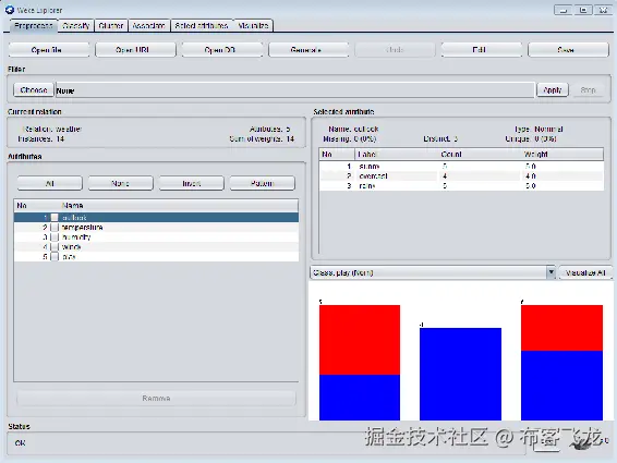 在前面的屏幕截图中,我们可以看到 ARFF 文件已经创建。我们已经展示了如何从 CSV 文件创建 ARFF 文件。我们不需要做任何手工工作来分配关系和属性,因为如果我们提供我们的 CSV 文件,它们是由 Weka 自动分配的。Weka 负责属性;它还负责处理它是什么类型的属性。例如,outlook是分类数据,因为它只有三种类型的值;因此,这些类别被分配给了outlook。由于temperature接受所有数值,它已经被 Weka 自动赋值为数值,并且由于humidity也只有数值,它也是数值。windy对象也是一个TRUE / FALSE值;因此,它也是一种分类类型的数据。play对象也只有两种类型的值,所以它也是分类数据。
