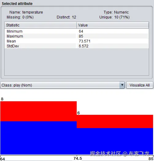 temperature属性有 12 个值,因为它是一个数值,我们可以从这些值中得到一些数值信息,比如最大值、最小值、平均值和标准偏差: