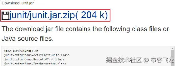 打开网络浏览器并搜索download a junit.jar。这将带您到一个链接,在那里您可以下载一个 JAR 文件。JAR 文件所在的地方有在线存储库。最可靠的仓库之一可以在 www.java2s.com/Code/Jar/j/… ?? 找到,在那里你可以下载任何可用的 JAR 文件。如果你点击它,它应该带你到下面的页面: