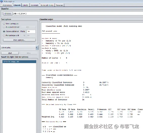 点击trees文件夹。假设我们想要执行一个 J48 分类:点击 J48 选项,然后点击 Start 按钮。将使用 10 重分类构建 J48 分类器,并将显示该特定数据的统计信息,如下面的屏幕截图所示: