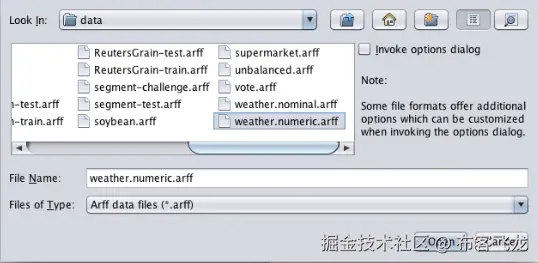 setFile方法将使用File对象,我们将为其指定名称weather.arff。现在,一切都已经在内存中完成了,数据集已经在内部转换成了 ARFF 格式,我们已经给它分配了一个名字(weather.arff);但是,我们还没有把它保存到磁盘上。