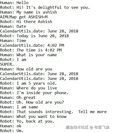 执行 Java 代码,您将看到提示说Human:,它将等待输入。按下 Q 将结束程序。根据我们的 AIML 文件,我们的对话是有限的,因为我们只要求基本信息。我们可以将它与super文件夹集成在一起,并将我们的 AIML 文件添加到super目录中,这样我们就可以使用默认的所有可用对话和我们的定制约会对话。