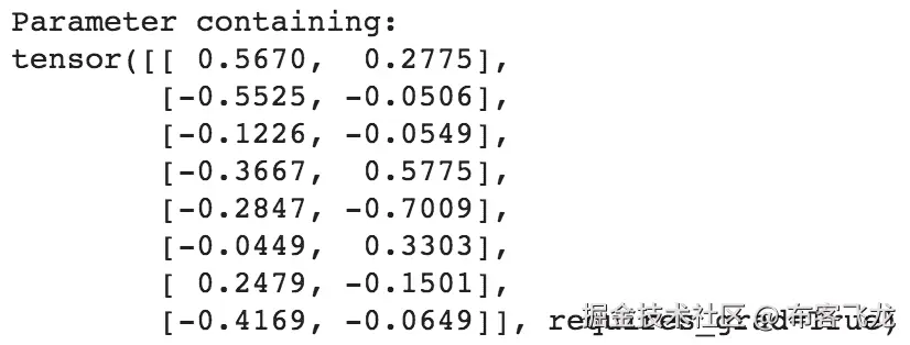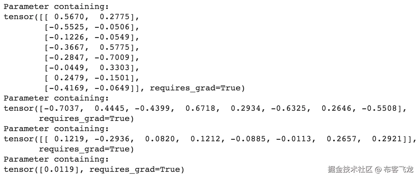 第一点在定义的__init__阶段处理,第二点在forward方法定义阶段处理。默认情况下,张量中的值在__init__阶段被随机初始化。但我们想要的是加载一组在训练模型时学习到的特定的权重(或值),并将每个值与一个特定的名称相关联。这是您通过调用一个特殊的方法获得的,将在下面的部分中描述。
