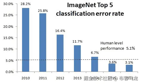计算机视觉中的一个突出任务是识别图像中存在的对象的类别。ImageNet 是一项旨在识别图像中存在的对象类别的竞赛。历年来分类错误率的降低情况如下: