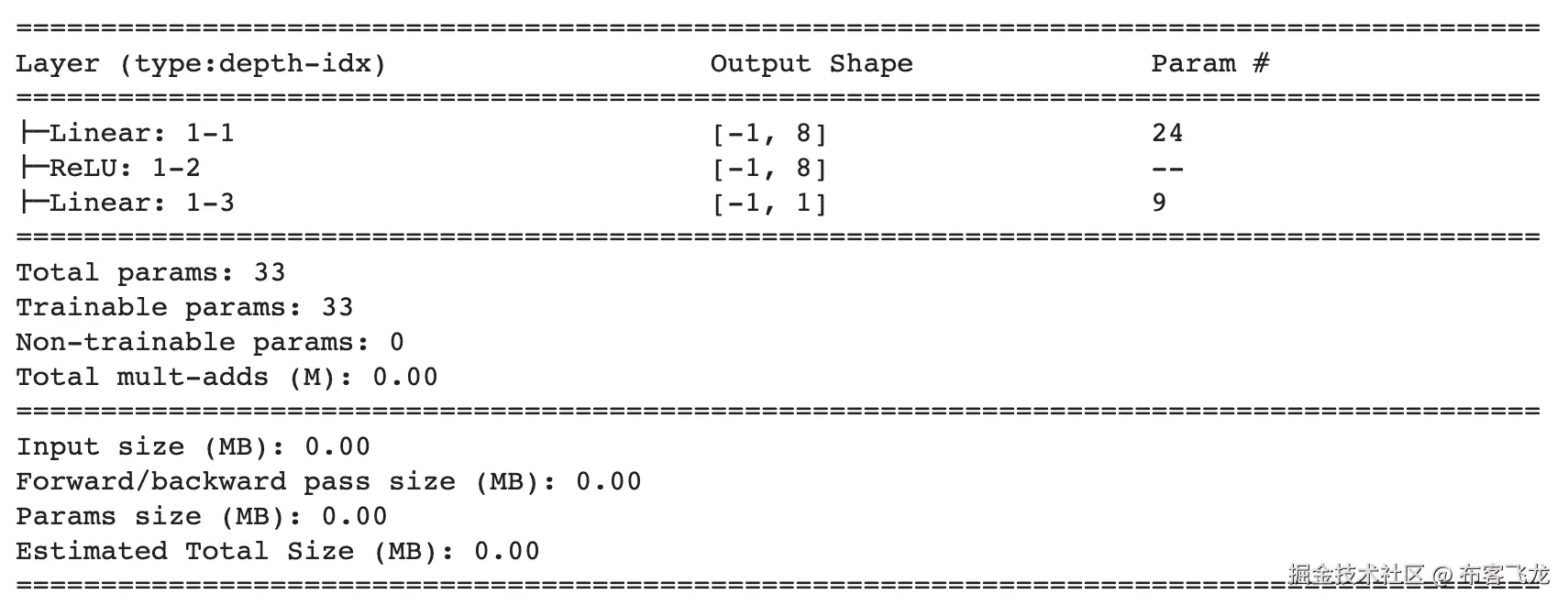请注意,第一层的输出形状是(-1,8),其中-1 表示可以有与批大小一样多的数据点,8 表示对于每个数据点,我们有一个八维输出,结果得到形状批大小 x 8 的输出。对下两层的解释是相似的。