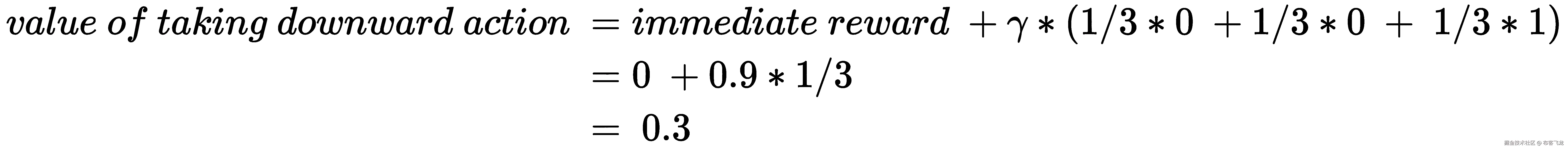 让我们了解如何获取第二个表中的单元格值(上图中的迭代 2 )。让我们将它缩小到 0.3,当它出现在第二个表的第 1 ^第行和第 2 ^第列时,通过采取向下的动作获得。当代理人采取向下行动时,有 1/3 的机会在下一个状态采取最优行动。因此,采取向下行动的价值如下: