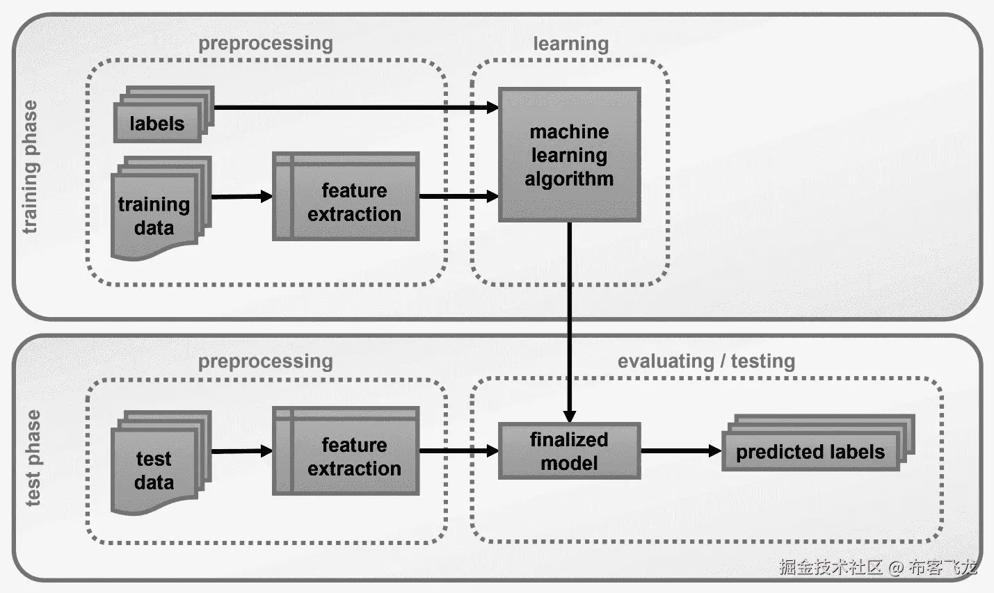 在监督学习中,我们有一个数据点的标签。现在,这可以是图像中捕获的对象的类别、面部周围的边界框、图像中出现的数字或任何其他东西。把它想象成一个老师,他不仅教书,还告诉你问题的正确答案是什么。现在,学生可以尝试设计一个模型或方程,考虑所有的问题及其正确答案,并找出一个有(或没有)正确答案的问题的答案。进入模型学习的数据称为训练数据,测试过程/模型的数据称为测试数据。这些预测有两种风格,例如用正确的动物识别新照片(称为分类 问题)或为其他二手车分配准确的销售价格(称为回归 问题)。不要担心这是否有点超出你的理解范围——我们会用整本书来确定细节。