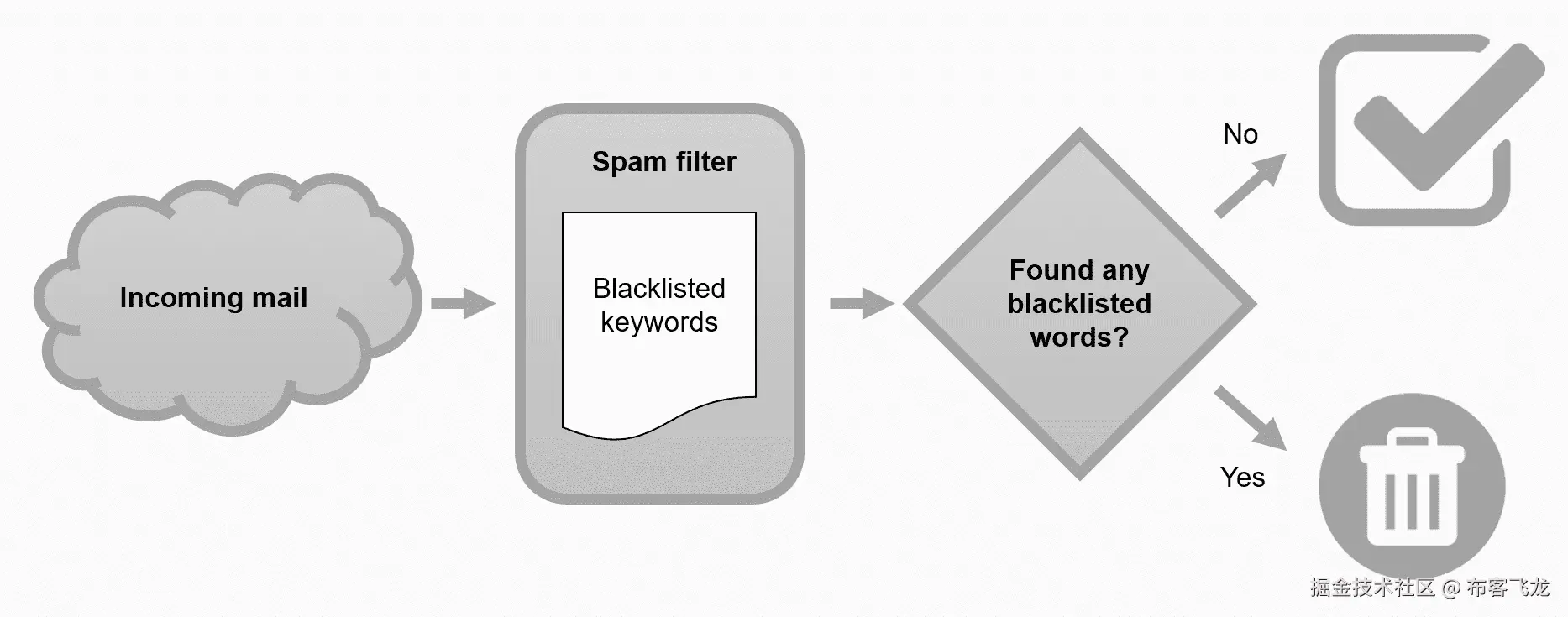 机器学习已经存在至少 60 年了。出于对人工智能的追求,早期的机器学习系统推断出if...else语句的手动编码规则来处理数据和做出决策。设想一个垃圾邮件过滤器,其工作是解析传入的电子邮件,并将不需要的邮件移动到垃圾邮件文件夹中,如下图所示: