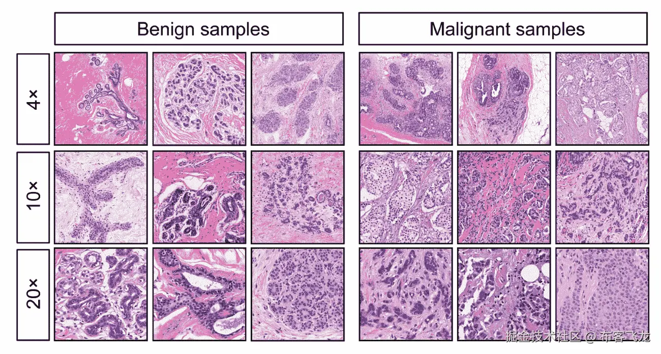 该数据集是医学影像研究的直接结果,被认为是当今的经典。数据集是从健康(良性)和癌性(恶性)组织的数字化图像创建的。不幸的是,我没能从最初的研究中找到任何公共领域的例子,但是图像看起来类似于下面的截图: