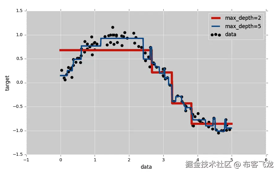 这里,粗红线代表深度为 2 的回归树。您可以看到树是如何使用这些粗略的步骤来近似数据的。较细的蓝线属于深度为 5 的回归树;增加的深度允许树进行许多更精细的近似。因此,该树可以更好地逼近数据。然而,由于这种额外的力量,树也更容易拟合噪声值,这尤其可以从图右侧的尖峰中看出。