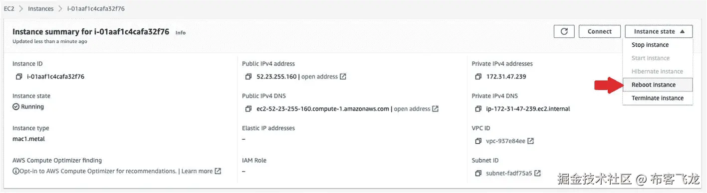 调整正在运行的 macOS 实例的附加 EBS 卷的大小后,在重新启动之前,该卷在实例中不可见。您可以从 EC2 控制台重启 macOS 实例,如图 5-4 和 5-5 所示。