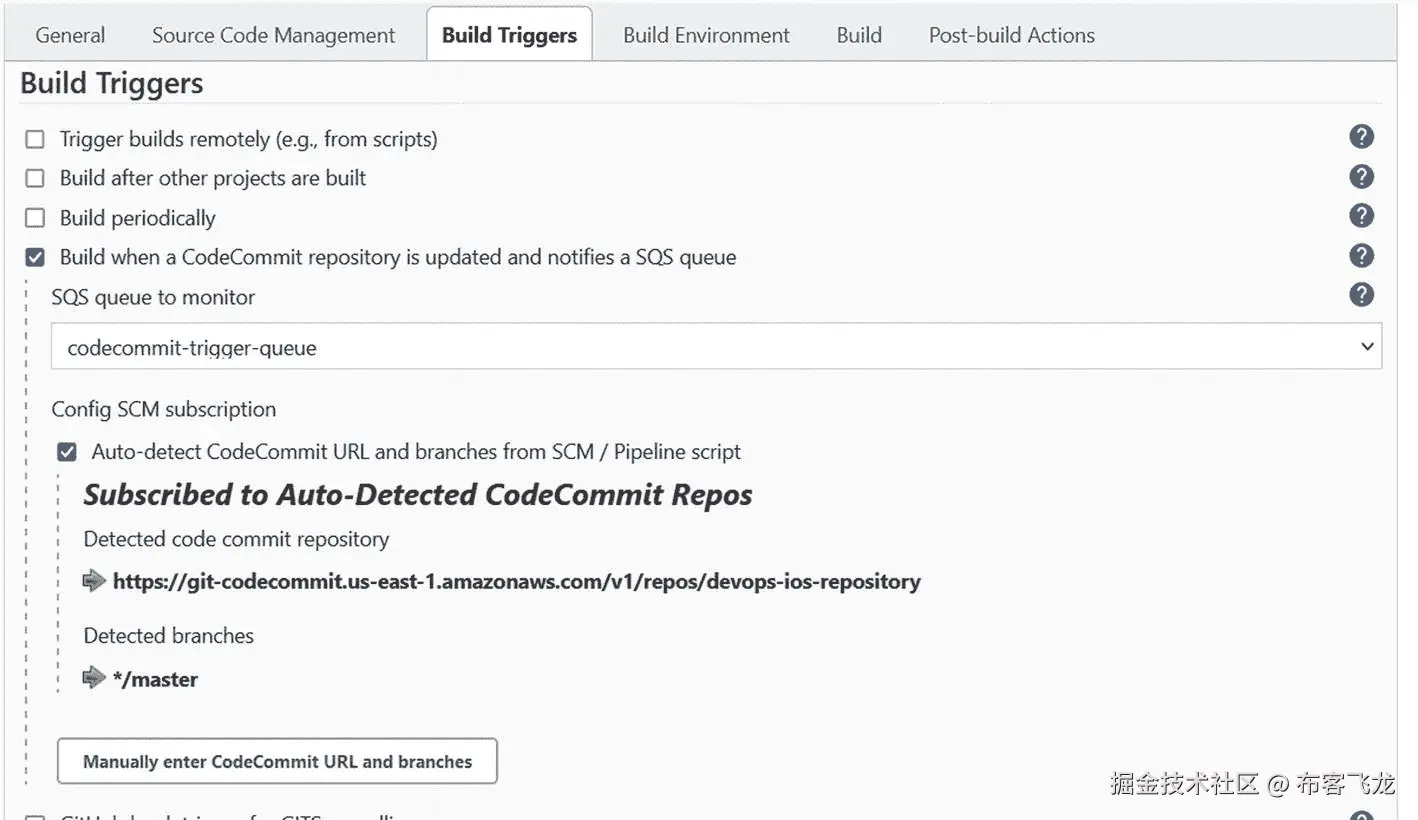 为自动构建配置构建触发器,如图 7-30 所示。显示了将由插件监控的 SQS 队列。