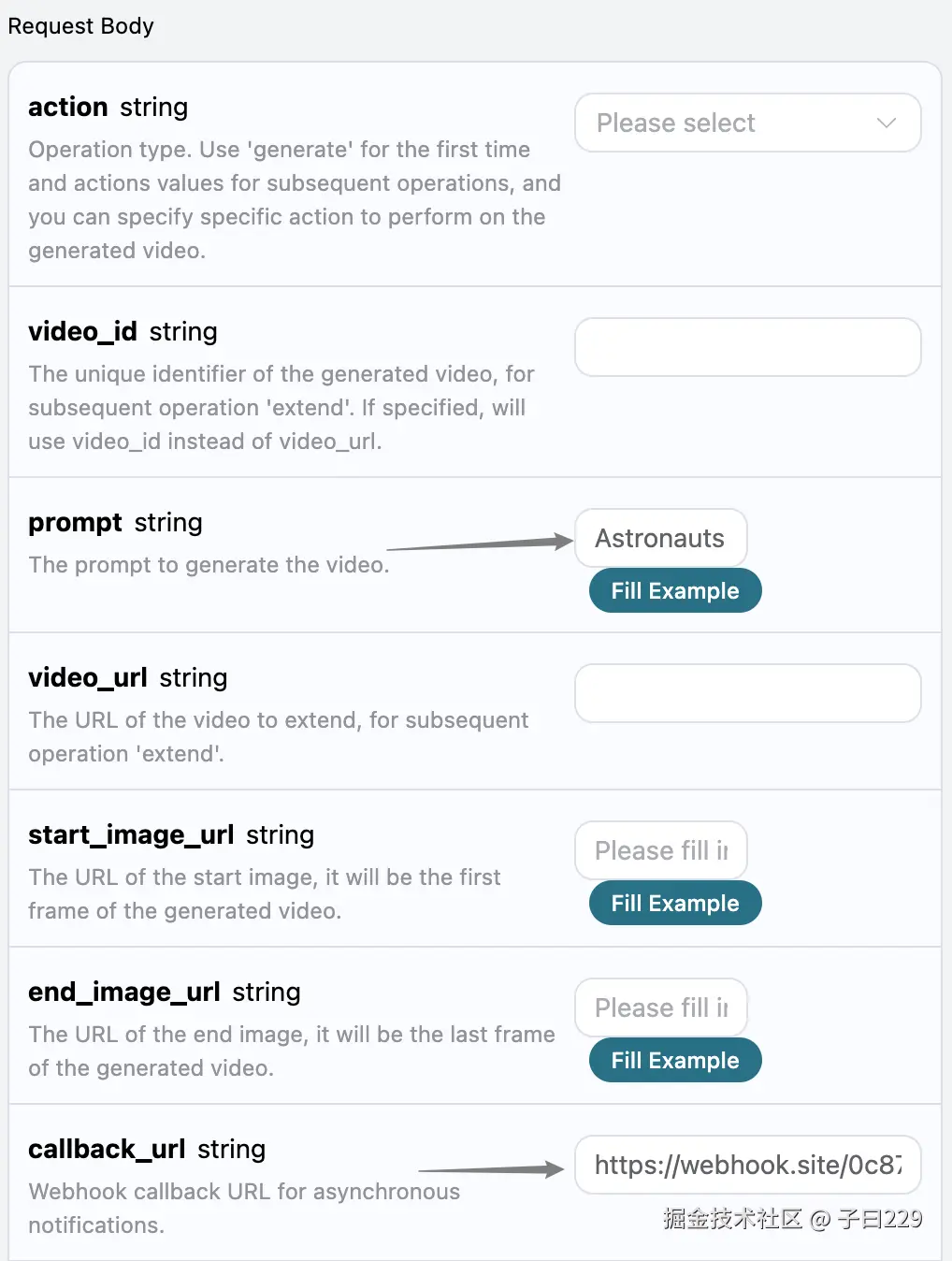 接下来,我们可以设置字段 callback_url 为上述 Webhook URL,同时填入 prompt,如图所示:
