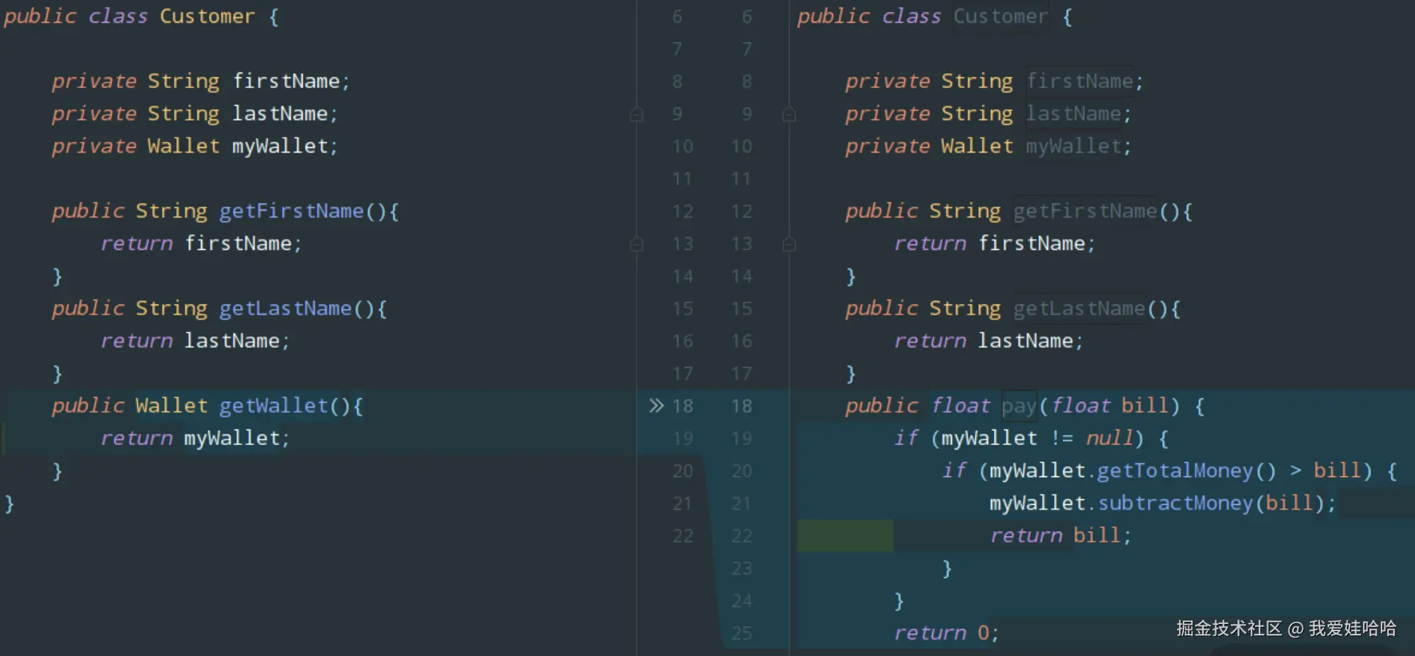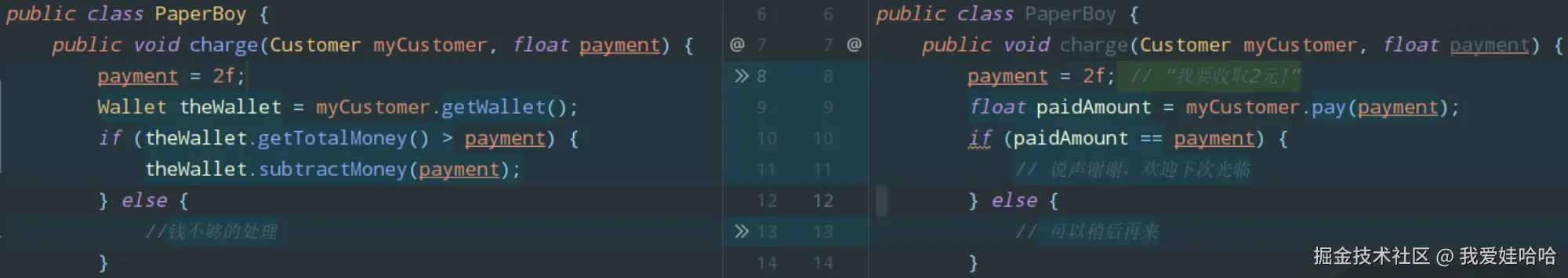 首先,我们将顾客“获取钱包”的动作修改为“支付账单”,代码修改前后对比如下图: