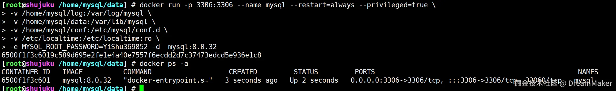 docker run -p 3306:3306 --name mysql --restart=always --privileged=true \