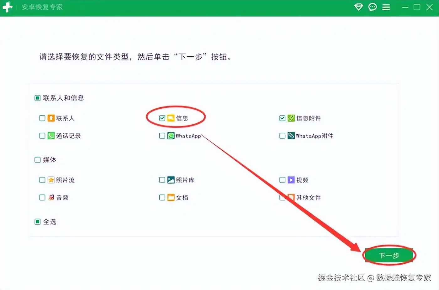 第二步:接下来,等待连接稳定,然后选择扫描的数据类型,即 【信息】 。点击 【下一步】 开启扫描。
