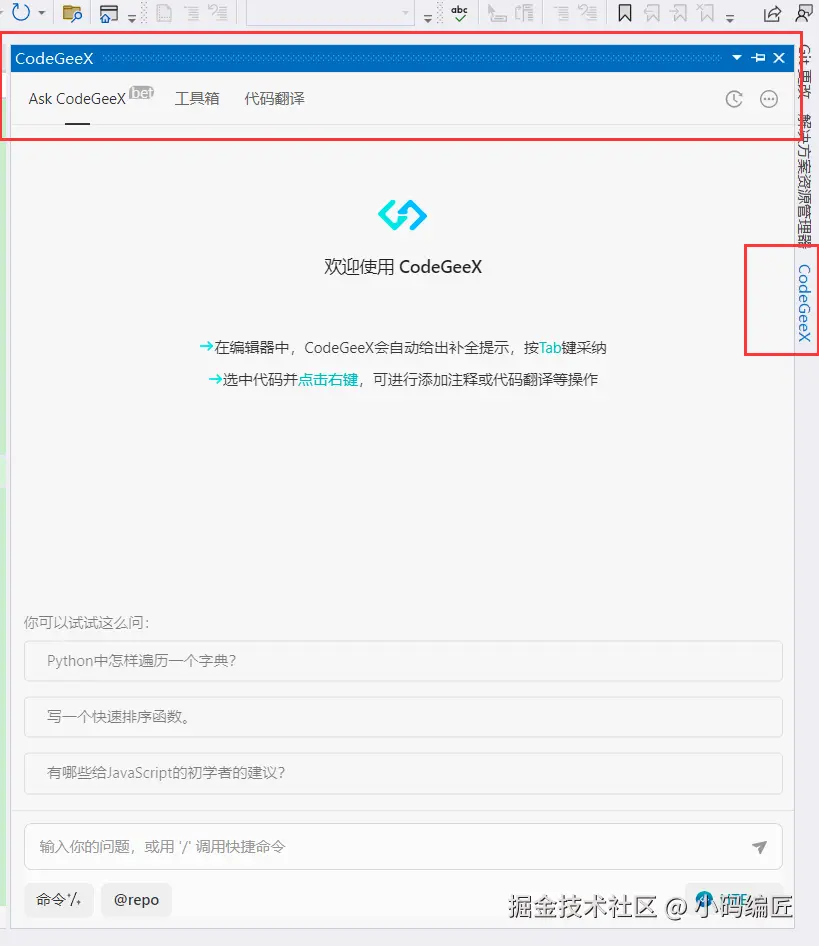 | AskCodeGeeX智能问答 | 通过侧边栏的智能问答交互,可以将开发中遇到的技术问题,直接向CodeGeeX提问获得快速解答。 |