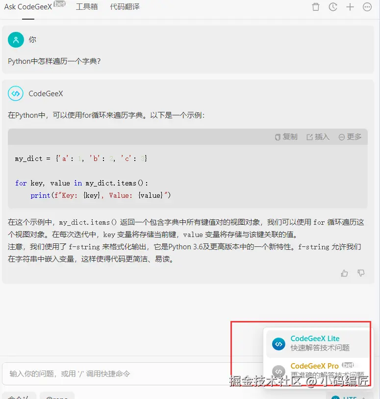 CodeGeeX 的智能问答支持模型选择,你可以选择Pro版模型或者Lite版的模型,点击CodeGeeX目录,打开 CodeGeeX 侧边栏(聊天窗),点击侧边栏上方的Ask CodeGeeX标签, 即可进入问答模式。