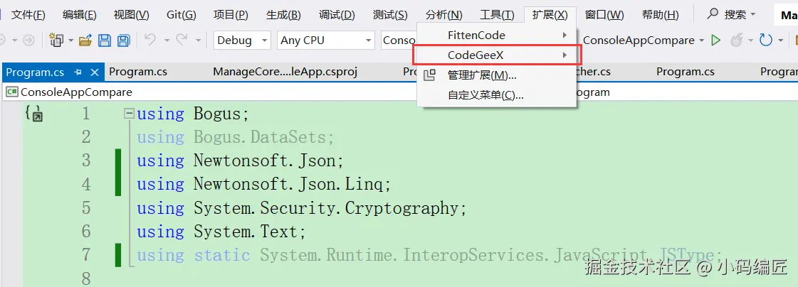 4、重新启动Visual Studio,就完成了安装,可以在Visual Studio 的扩展看到CodeGeeX目录,具体如下图所示: