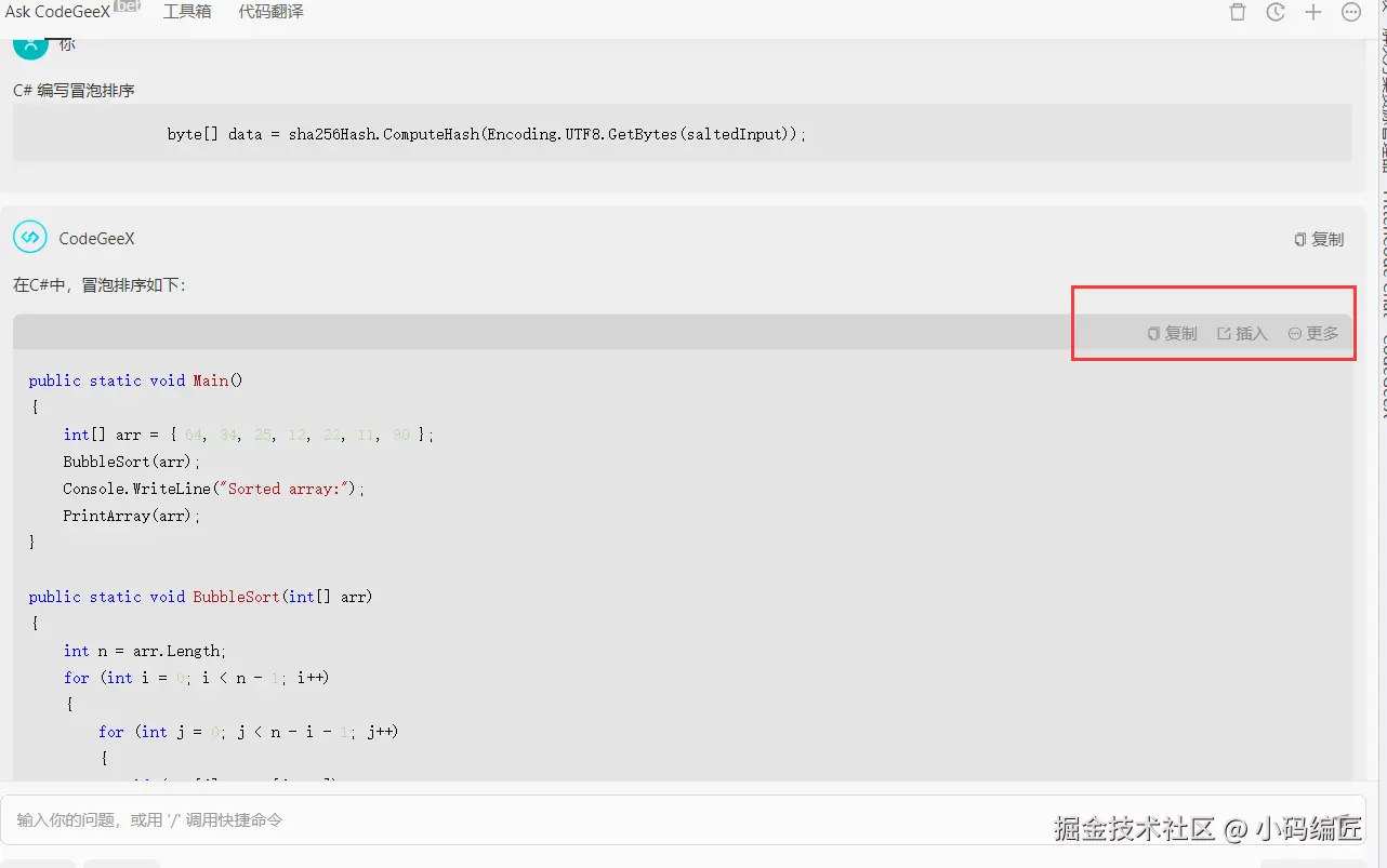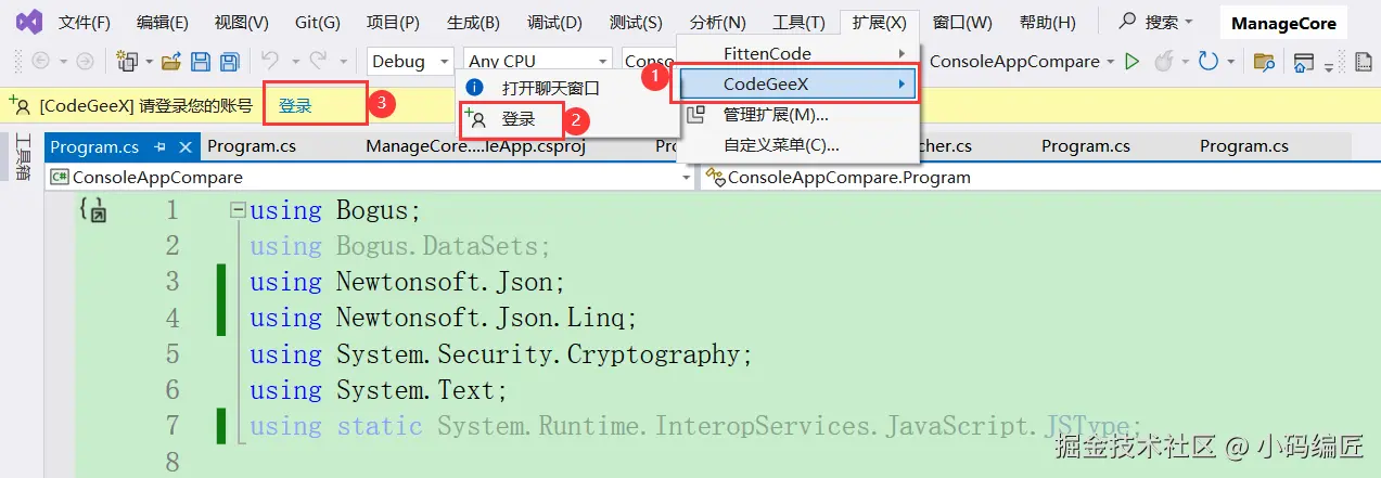 CodeGeex 在Visual Studio 中的使用方式,保持了它在Visual Studio Code 和 JetBrains IDEs 全家桶的使用方式,您可以无缝的拓展到不同IDE平台来使用。