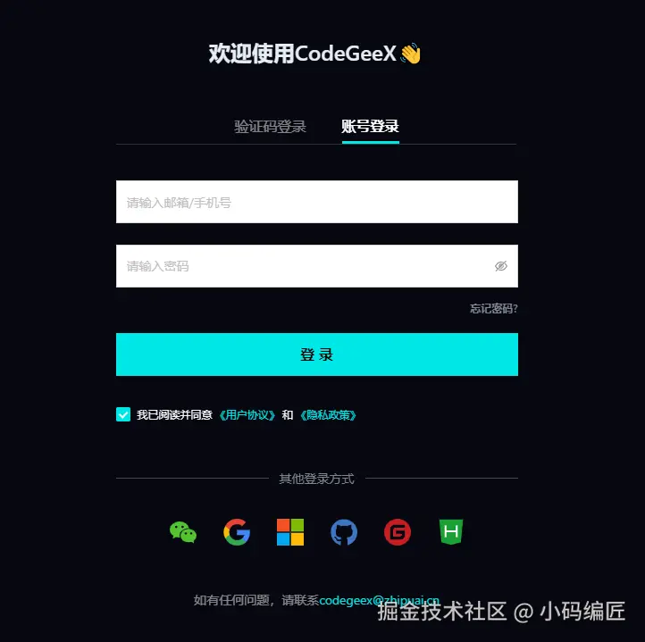 这里通过CodeGeeX的侧边栏登录,可以选择验证码登录,账号登录,第三方账号登录。通过第三方登录,然后绑定手机号,就可以使用CodeGeeX的全部功能,开启倍速编程的体验吧!