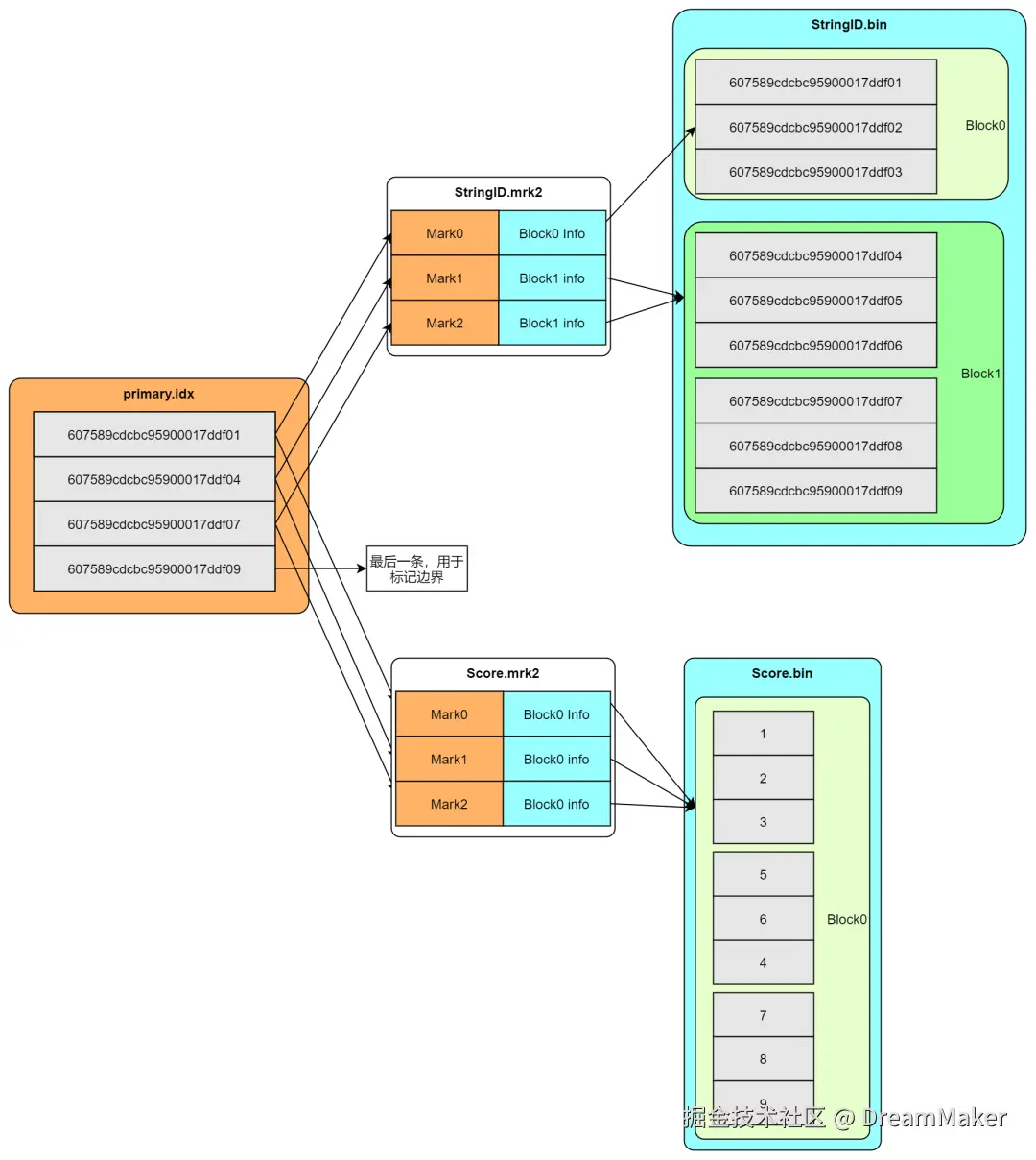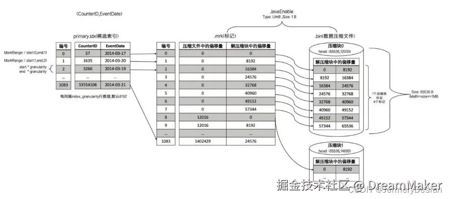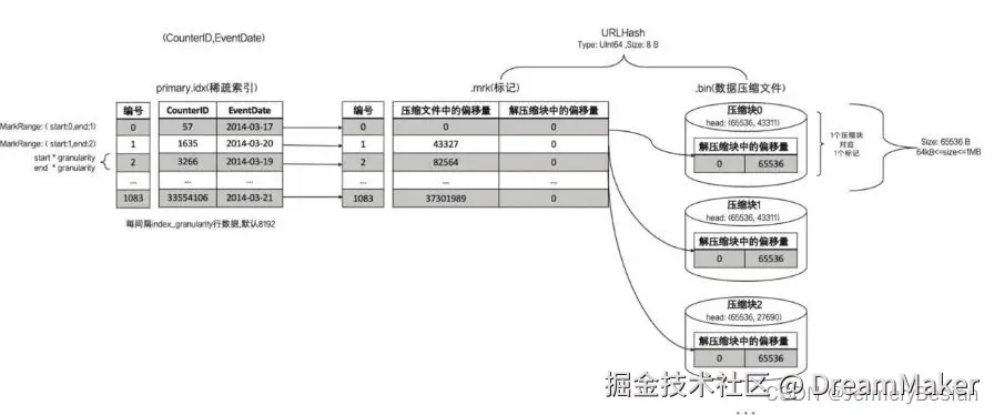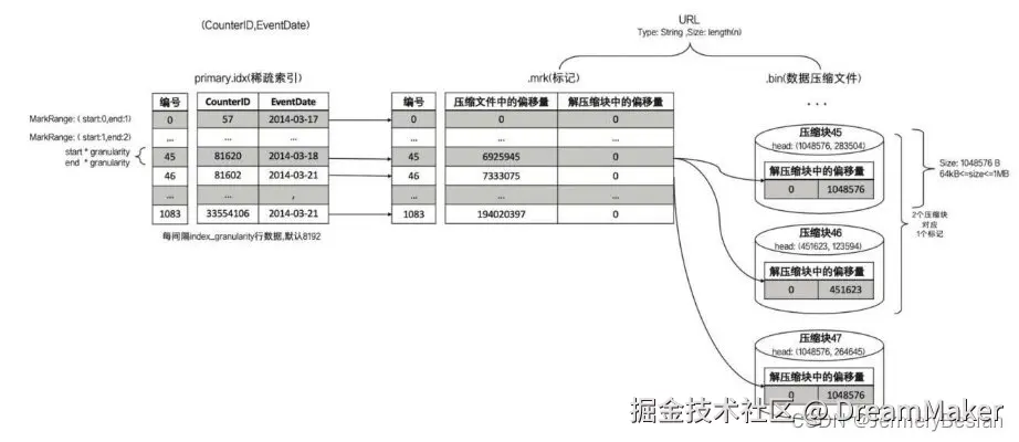 一个{column}.bin文件由1个至多个数据压缩块组成,mrk2数据标记文件格式比较固定,primary.idx文件中的每个索引再次文件中都有一个对应的mark,有三列: