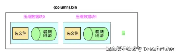 {column}.bin:实际列数据的存储文件,以列名.bin为文件名,默认设置采用lz4压缩格式。每一列都会有单独的文件,此种方式是wide part模式。另外一种是compact part模式,这种模式下所有的列数据都放在一个data.bin文件里(新版本需要指定 SETTINGS min_rows_for_wide_part = 0, min_bytes_for_wide_part = 0 参数来强制跳过 Compact format)。