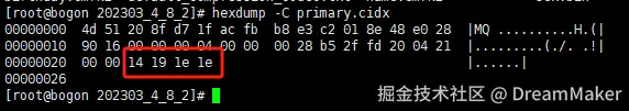 可以发现,转换成10进制后与我们的逻辑分析结果一致,更进一步核实了ClickHouse中primary.idx稀疏索引的原理。