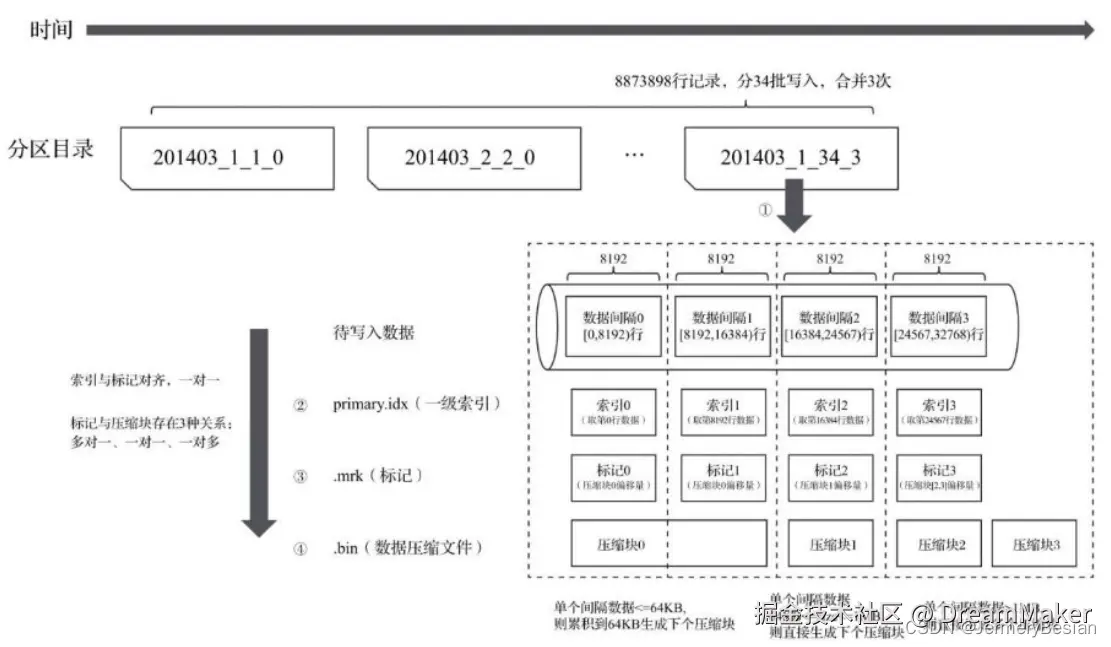 {column}.cmrk2:列数据的标记信息,记录了数据块在bin文件中的偏移量。标记文件首先与列数据的存储文件对齐,记录了某个压缩快在bin文件中的相对位置;其次与索引文件对齐,记录了稀疏索引对应数据在列存储文件中的位置。ClickHouse将首先通过索引文件定位到标记信息,再根据标记信息直接从bin数据文件中读取数据。