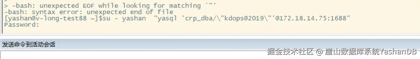 【YashanDB数据库】yasql登录有特殊字符@导致无法登录 崖山数据库系统YashanDB 2024-08-13 32 阅读1分钟 问题备机 Linux bash shell环境下,使用yasql登录数据库没有使用转义导致登录失败。报错信息如下 问题分析 linux特殊字符转义问题,多加几层转义可以解决问题。 解决办法 su - yashan2 -c "yasql tester/\\\"tet@123\\\"@192.168.33.103:4688"