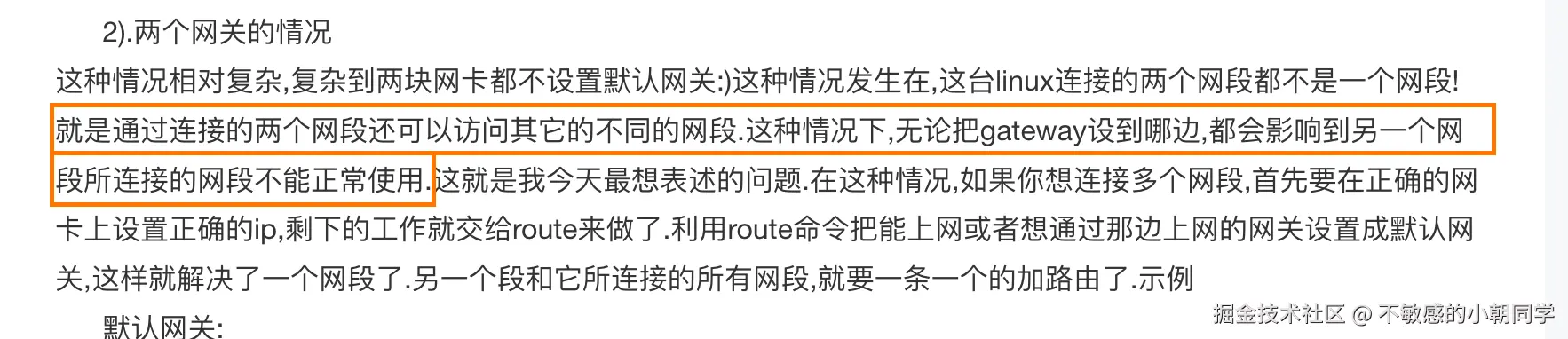 注意:Linux 路由可以配置多个,但是默认的网关是只能有一个的;默认网关是指当主机要发送数据包到目标网络时,如果没有更具体的路由表项匹配,就会使用默认网关来转发数据包