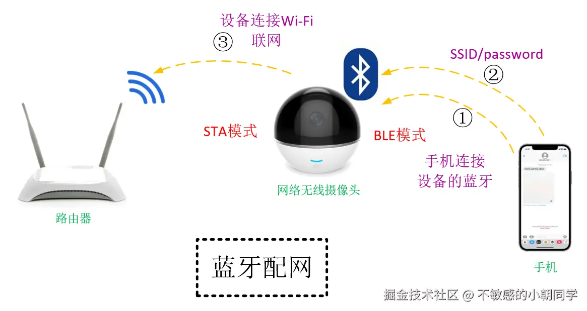 - 手机通过 BLE (低功耗蓝牙) 将Wi-Fi路由器的配网信息(SSID/password)发送给设备端