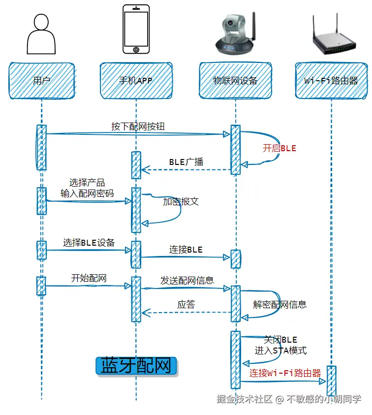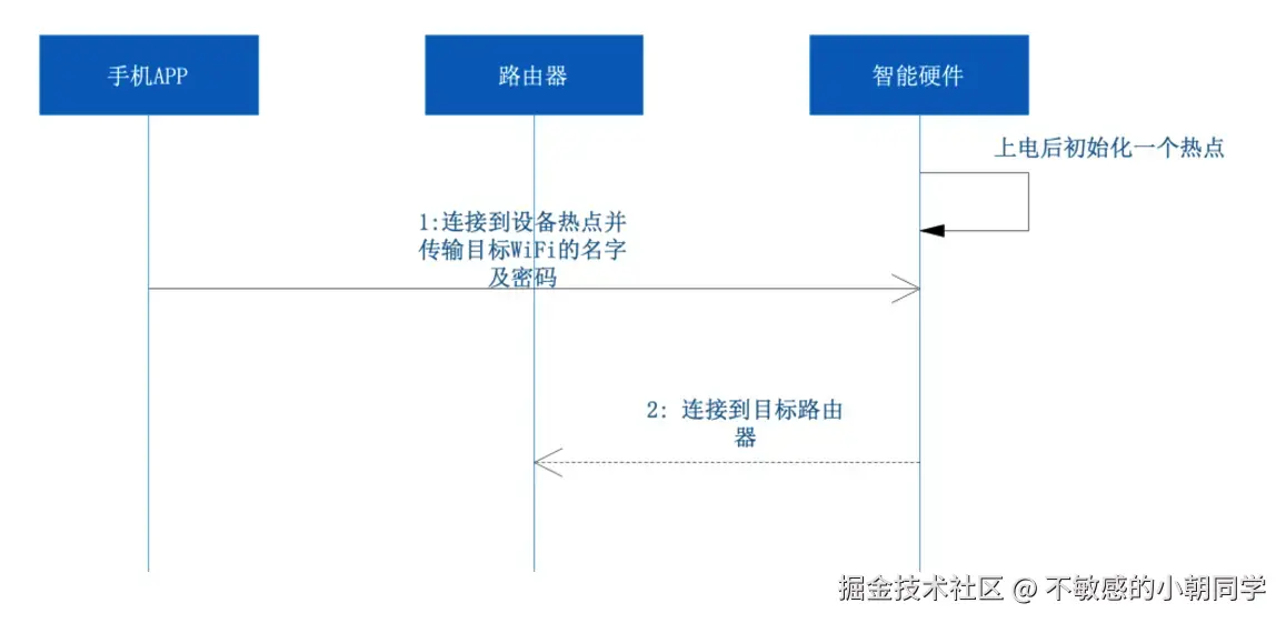 将以上配网过程,画成时间序列图,则用户、APP、物联网设备、路由器这四者的交互关系为: