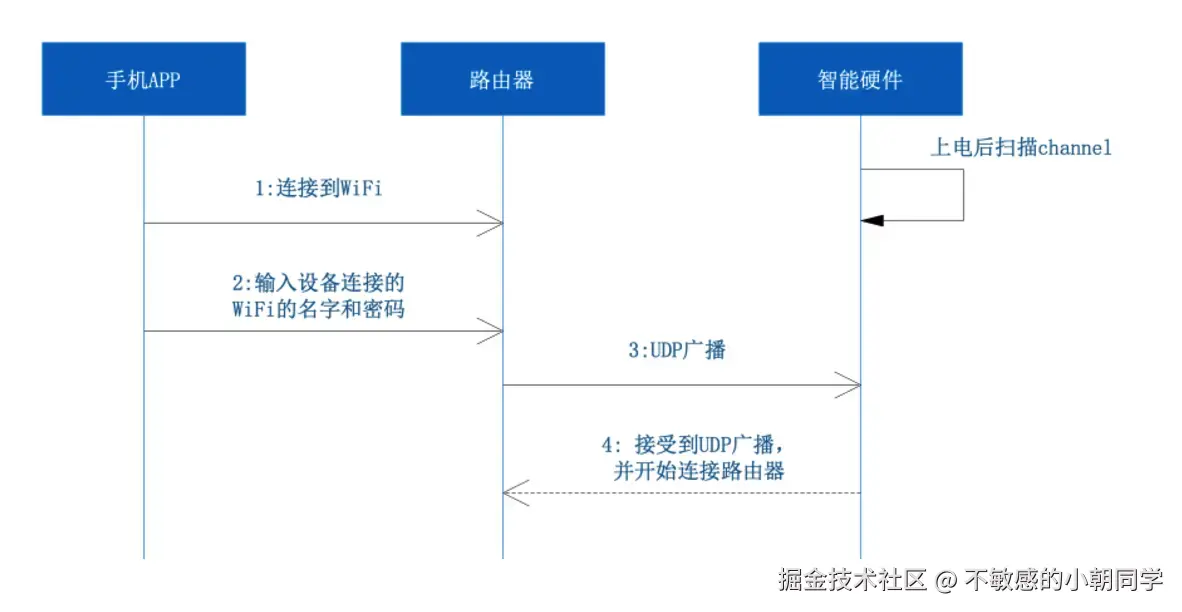 SmartConfig 是手机通过广播发送上网信息( 目标路由器参数),设备通过监听方式获取信息,然后连接上网的方案。该方案只需要用户输入 WiFi 的名称及密码,点击开始配网即可完成配网操作
